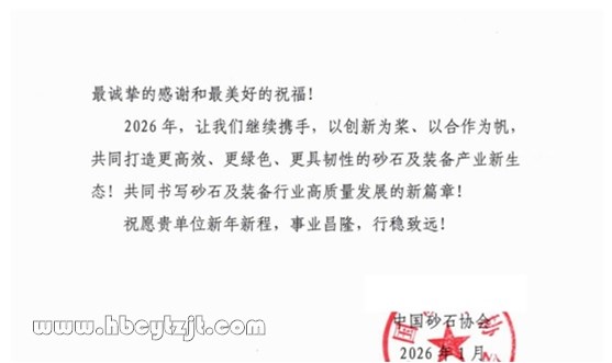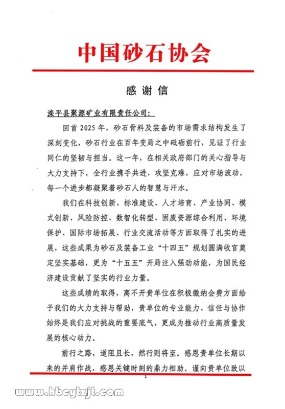 中國砂石協會向聚源礦業發來感謝信
